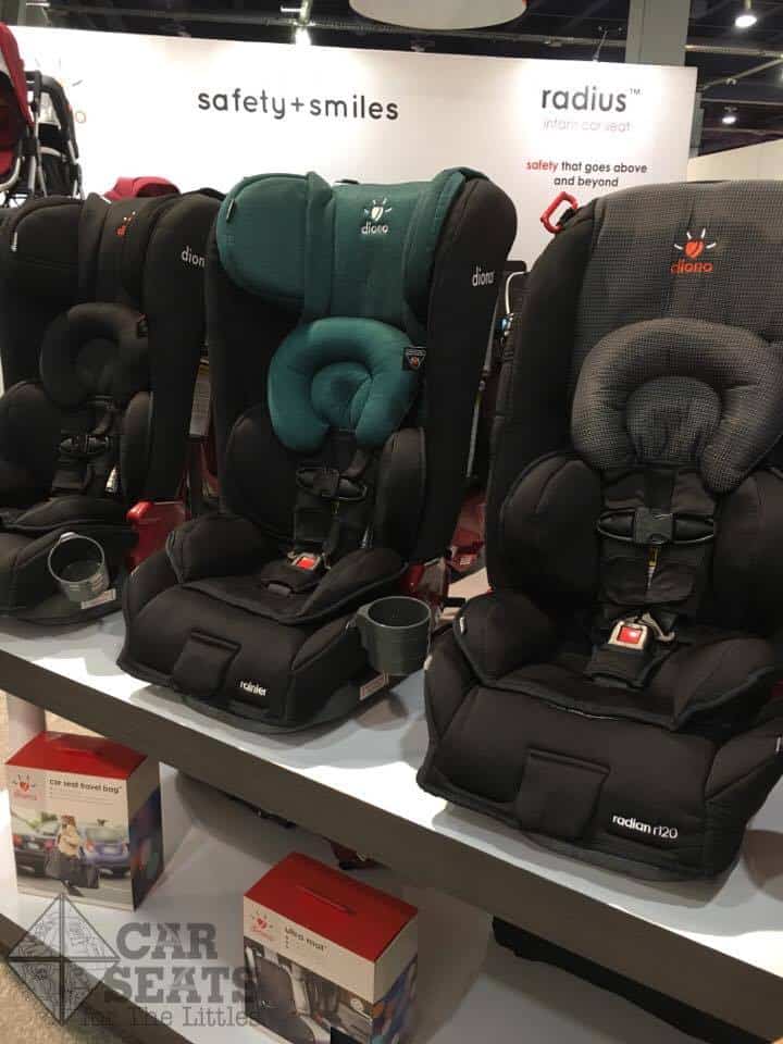 A stop by the Diono booth revealed an exciting new offering: the Radius rear facing only car seat. This premium seat was inspired by the Radian and boasts some unusual features. With a 35 lbs and 35″ weight and height capacity, it will be one of the longest lasting rear facing only seats on the market. The carrier itself weighs only just over 10 lb, but the base is solid, with rigid lower anchor connectors and an anti-rebound bar that extends into steel reinforcement through the entire length. While the seat itself is still a prototype, we got a close up look at the design for the canopy, which will include an extension to the foot of the seat and the recline mechanism, which can be adjusted while the seat is installed from the greatest recline for a newborn to quite upright for an older toddler. The predicted price point is $329. We will take a closer look when it’s released July 2017.